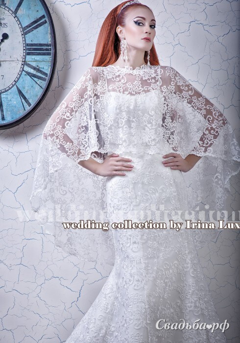 Кружевное свадебное платье с пелериной. Силуэт Русалочка. Лиф открытый. Бретели тонкие, изящные. По всей длине платье задекорировано тончайшим кружевным полотном с искусными рельефными узорами. Накидка также выполнена из кружева. Её наличие даёт возможность рассматривать эту модель в качестве наряда для венчания.