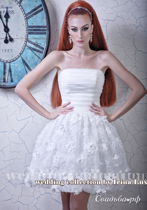 Короткое свадебное платье с пышной юбкой. Прямой лиф украшен горизонтальной строчкой. Он выглядит очень сдержанным и даже строгим, особенно, по сравнению с воздушной юбкой. Сама же короткая юбка полностью расшита достаточно объёмными цветами из ткани и похожа на небольшой нежный свадебный букетик.