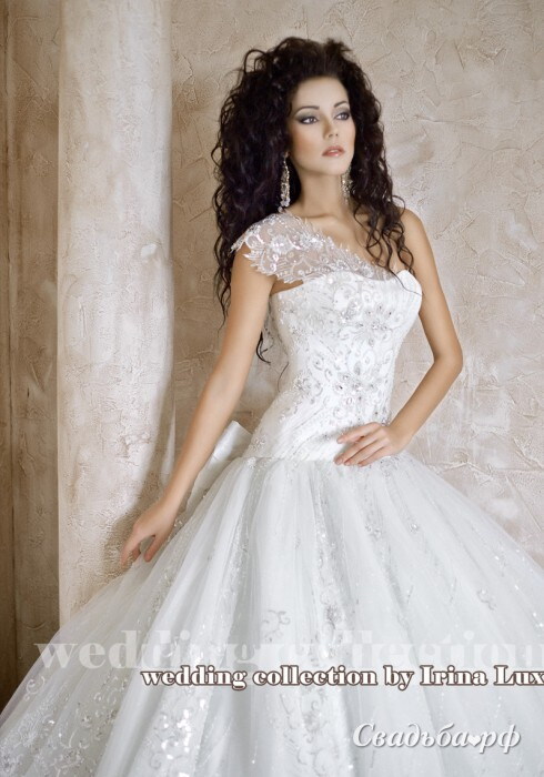 Пышное свадебное платье с ажурной бретелью через плечо. Строгий корсет с фигурным лифом украшен стразами и камнями. Такие же узоры разбросаны по всей поверхности платья. На спине, чуть ниже линии талии - шикарный большой бант. Юбка очень большая и пышная, с достаточно большим шлейфом. Наряд, достойный королевской особы.