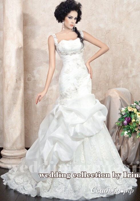 Шикарное свадебное платье со стразами и камнями. Лиф модели задрапирован кружевом. Прямо под грудью в центре находится небольшая красивая брошь. В разные стороны от неё расходится расшитая стразами и камнями тесьма, которая превращается в бретели. Юбка собрана объёмными воланами и отделана понизу широкой кружевной лентой.