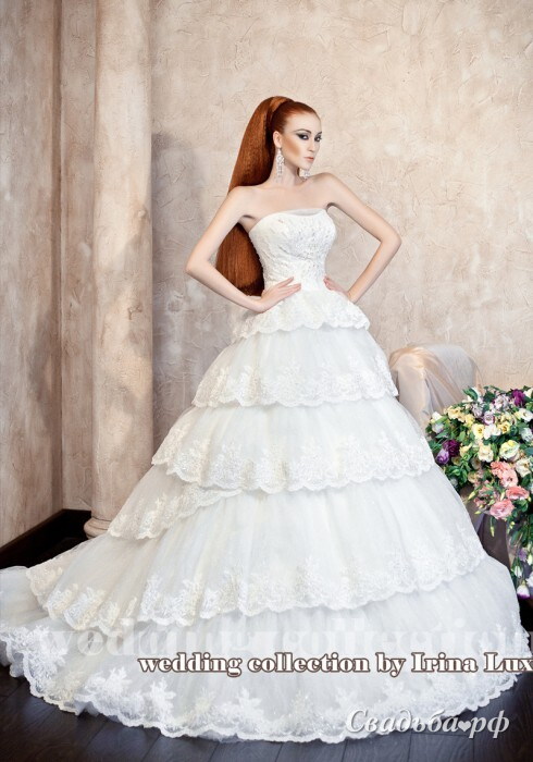 Роскошное пышное свадебное платье для стильной и уверенной в себе невесты. Открытый лиф задекорирован шифоном и расшит стразами и бисером. По линии талии начинается огромная юбка с длинным шлейфом. Она состоит из нескольких ярусов кружевной ленты и делает образ невесты более нежным и даже волшебным.