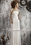Оригинальное струящееся свадебное платье, отрезное под грудью. Бретели в виде воланов - крылышек расшиты бисером и стразами. Прямой лиф и длинная свободная юбка также выполнены из тончайшего кружевного полотна и расшиты стразами. Красивая цветочная композиция расположилась на лифе и широком поясе.