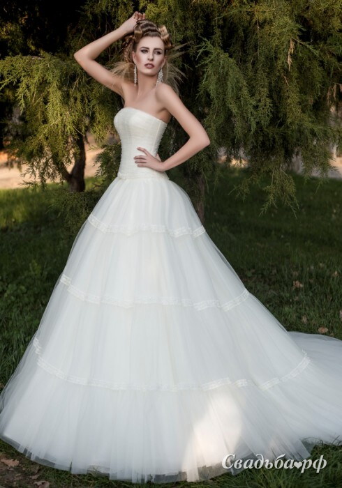Поистине королевское свадебное платье поможет создать нежный образ современной невесты. Элегантный корсет с открытой зоной декольте выгодно подчёркивает талию и зрительно увеличивает бюст. Пышная юбка из невесомого фатина декорирована более плотными горизонтальными вставками. Представленный наряд можно дополнить накидкой-болеро.