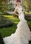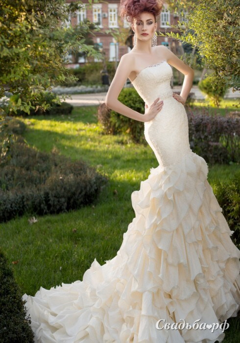 Роскошное свадебное платье силуэта Рыбка эффектно подчеркнёт все соблазнительные изгибы вашей фигуры. Заниженный корсет с открытой зоной декольте зрительно увеличивает бюст. От середины бедра юбка начинает расширяться и переходит в кокетливый шлейф. Многоярусные воланы и сборки придают наряду особое очарование.