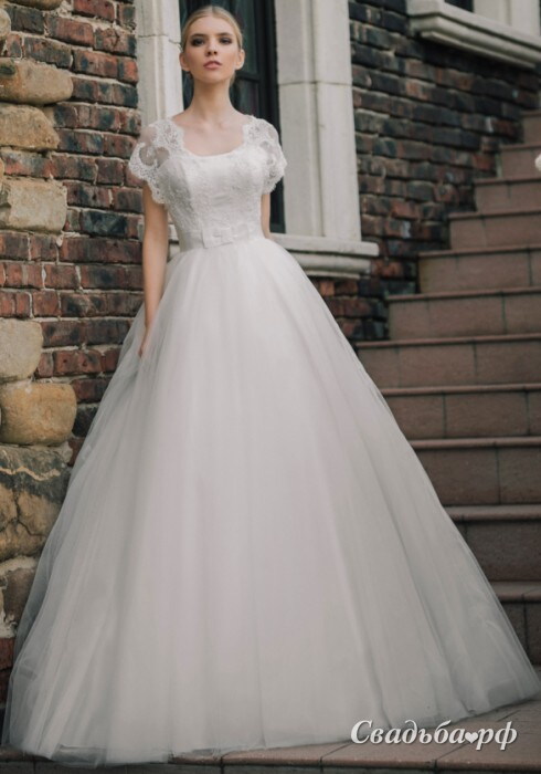 Свадебное платье с пышной юбкой из воздушного фатина. Талию изящно подчеркивает широкий поясок с кокетливым бантиком спереди. Плечи прикрывает кружевное болеро. Лёгкая многослойная юбка идеально дополняет этот нежный классический свадебный образ. Настолько изысканный наряд придётся по вкусу даже самым требовательным невестам.