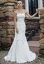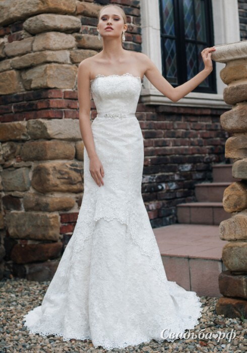 Свадебное платье силуэта русалка из нежного кружева. Верх – открытый с элегантным прямым лифом, за контуры которого кокетливо выступают кружевные узоры. Линию талии подчеркивает гармоничный поясок из гладкой ткани с изящной вышитой композицией спереди. В комплект входит романтичное кружевное короткое болеро, прикрывающее плечи.