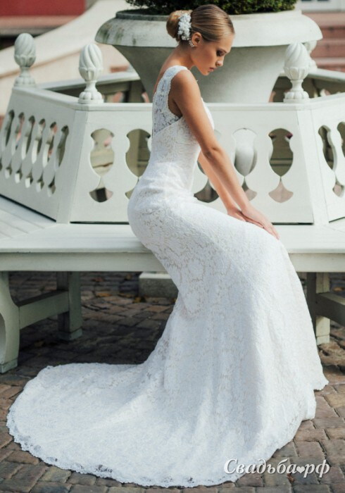 Элегантное свадебное платье прямого силуэта из тончайшего кружева. V-образный пикантный вырез эффектно подчёркивает женственную красоту зоны декольте и плавно переходит в широкие бретели. Небольшой шлейф является гармоничным продолжением романтичной длинной юбки. Модель представляет собой воплощение изысканности и элегантности!