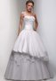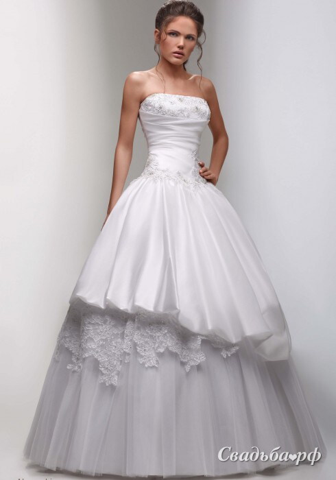Свадебное платье с открытой зоной декольте. Материал тафта очень пластичен и позволяет создавать сногсшибательные складки, как у этой пышной юбки с ажурными кружевными украшениями и подолом из тончайшего фатина. Изящный корсет дополнен лёгкой драпировкой и нежным узором ручной работы. В этом свадебном платье вы будете неотразимы.
