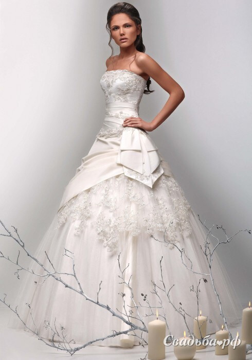 Необыкновенное свадебное платье для тех, кто хочет почувствовать себя настоящей принцессой. Элегантный корсет наряда богато декорирован цветочными узорами ручной работы. Пышная юбка из тончайшего фатина и тафты дополнена оригинальной драпировкой и слоем нежного кружева. Представленная модель постепенно расширяется к полу.