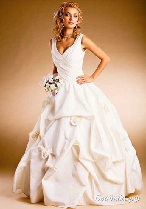 Классический V- образный вырез поможет подчеркнуть красивую линию декольте. Широкие бретельки привлекают внимание к плечам. Матовая тафта делает платье непохожим на остальные модели из органзы и тюля, в чем его несомненное достоинство. Пышная юбка декорирована асимметричными прихватами и изящными цветами из ткани.