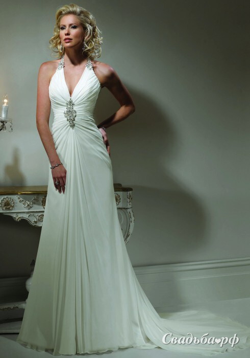 Свадебное платье для женщины, ценящей шик и изящество. Платье украшено богатой брошью, которая, с одной стороны, визуально собирает ткань и образует глубокое декольте, с другой – красивые струящиеся складки на юбке прямого покроя. Декольте с V-образным вырезом, верх платья плавно переходит в бретельку через шею.
