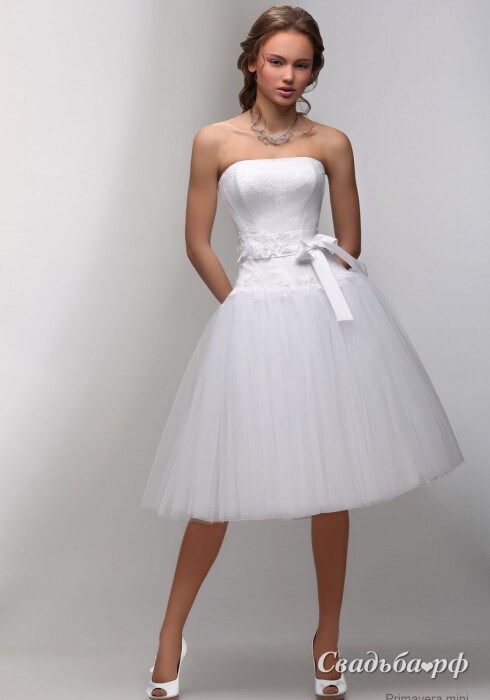 Короткое свадебное платье с пышной юбкой. Укороченный до колен подол платья из нескольких слоев фатина демонстрирует красивые ножки невесты. Элементы декора этого наряда: расшитый корсет, игриво повязанный бантик и кружева на талии. Образ невесты в таком наряде получится легкий и игривый. Это платье не только красивое, но и очень удобное.