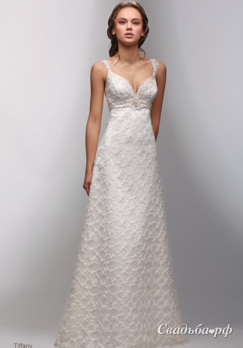 Это свадебное платье является воплощением элегантности и хорошего вкуса. Необычное оформление бретелей и лифа придают свадебному платью романтический образ. Сшито платье из великолепного кружева, благодаря которому Ваш образ станет еще прекраснее и изысканнее. Лиф с глубоким декольте и декоративным пояском под грудью добавят образу элегантности и шарма.