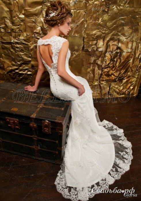 Изящное свадебное платье для элегантной невесты. Модель силуэта Русалочка состоит из гладкой основы и кружевного верхнего слоя. Очень интересно оформлена спинка платья: кружево обрамляет треугольник спины и соединяется в бесконечном ряду крохотных пуговиц. Бесплатно: подгонка платья по фигуре, хранение платья, репетиция прически.
