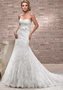 Открытый фигурный лиф модели, как, впрочем, и всё платье, выполнен из тончайшего кружевного полотна. Гладкий пояс, украшенный цветком с кристаллами Swarovski, выгодно подчёркивает линию талии. Расширяющаяся книзу юбка соблазнительно обтягивает бёдра невесты и превращается в длинный лёгкий шлейф сказочной феи.