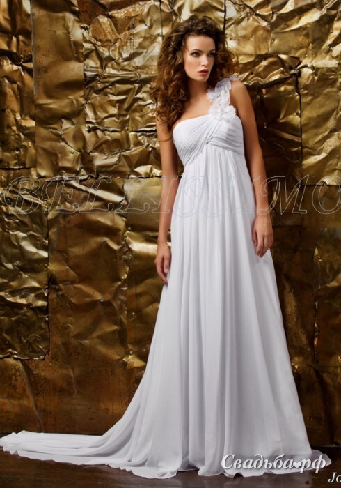 Платье Britney Rose в греческом стиле. Единственная бретелька украшена изысканной цветочной композицией. Лиф задрапирован лёгким шифоном. А длинная юбка свободными невесомыми волнами ниспадает к ногам богини свадебного торжества. Длинный шлейф делает этот образ более царственным. Но кто сказал, что богиня не может царствовать?