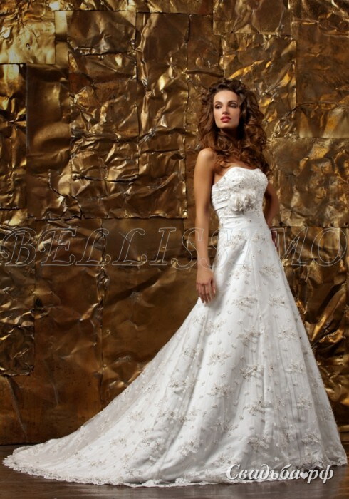 Платье Britney Rose А-силуэта из расшитого кружева. Открытые плечи невесты волнуют взгляды и вызывают восхищение. Красивые формы плотно обтянуты лифом. Гладкая лента с украшением-цветком под грудью акцентирует внимание на линии талии. А широкая юбка со шлейфом даёт возможность почувствовать себя королевской особой.