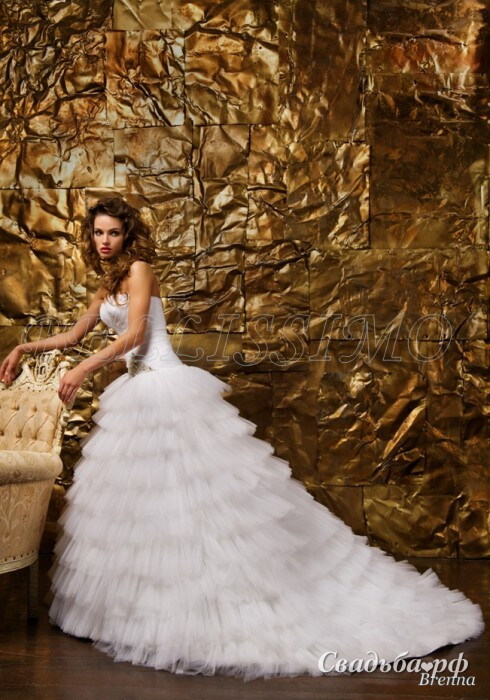 Пышное платье Britney Rose с заниженным корсетом и многоярусной юбкой из фатина. Открытый лиф выгодно подчёркивает идеальные формы невесты. Заниженная линия талии украшена большой рельефной вышивкой из бисера и бусин. Огромная юбка со шлейфом превращает обыкновенную девушку в принцессу из сказочной страны.