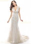 Элегантный свадебный наряд поможет в создании нежного и женственного образа. Декольтированный верх, кружевные бретели, открытая спина – все это придает наряду соблазнительность. Идеально подчеркнута линия бедер и талии. По всему периметру платье украшено вышивкой ручной работы. Свадебное платье Maggie Sottero, коллекция 2014 года.