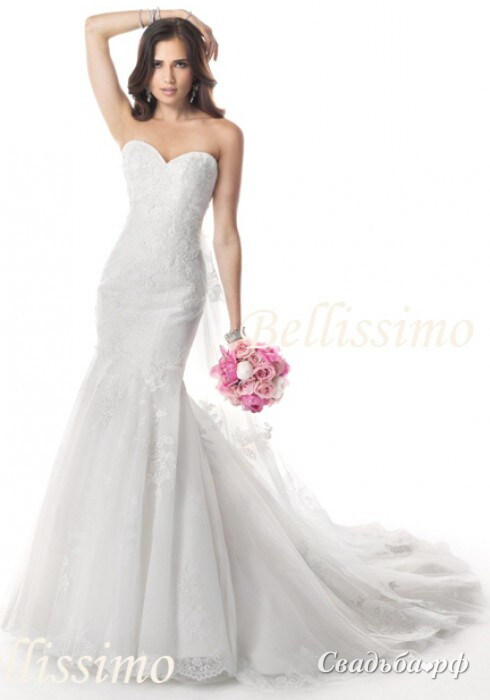 Элегантное свадебное платье силуэта рыбка. Полукруглый жесткий лиф-сердечко декорирован изысканным кружевом ручной работы, тугой корсет идеально подчеркивает линию талии. Многослойная юбка имеет необычную структуру – в нижней своей части представлена многочисленными складками. Воздушный накладной шлейф завершает созданный образ.