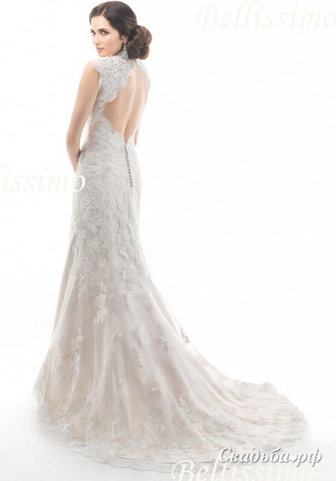 Шикарное свадебное платье классического А-силуэта. V-образный вырез, широкие симметричные бретели из тончайшего изысканного кружева, идеальная силуэтная линия. Необычность и соблазнительность свадебному наряду придает эффектный декор спины и длинный полукруглый шлейф, украшенный выручкой ручной работы. Это платье Maggie Sottero, коллекция 2014 года.