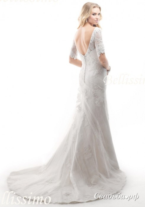 Роскошное, нежное кружевное свадебное платье с изящной французской лодочкой,и короткими рукавами, которые придают образу женственность и элегантность. Скромное декольте, идеально подчеркнутая линия талии и бедер, многослойная юбка, струящаяся вниз легкими складками и плавно переходящая в полукруглый шлейф средней длины. Платье Maggie Sottero из коллекции 2014 года!