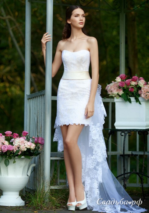 Экстравагантное свадебное платье выполнено в достаточно оригинальном стиле. Жесткий полукруглый лиф придает наряду практичность, тугой корсет и широкий атласный пояс выгодно подчеркивают линию талии. Кружевная юбка доходит до середины, демонстрируя всю красоту ног невесты, а эффектный шлейф из воздушного фатина, украшенного вышивкой ручной работы, сделает Ваш образ и неповторимым.
