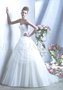 Эффектное свадебное платье с открытым фигурным лифом. Заниженный драпированный корсет, плавно переходящий в многоярусную юбку из французской сетки, соблазнительно обтягивает фигуру. По сравнению с мягкой драпировкой особенно эффектно смотрится великолепная вышивка, покрывающая корсет и украшенная бисером и бусинами. Юбка – пышная, со шлейфом.