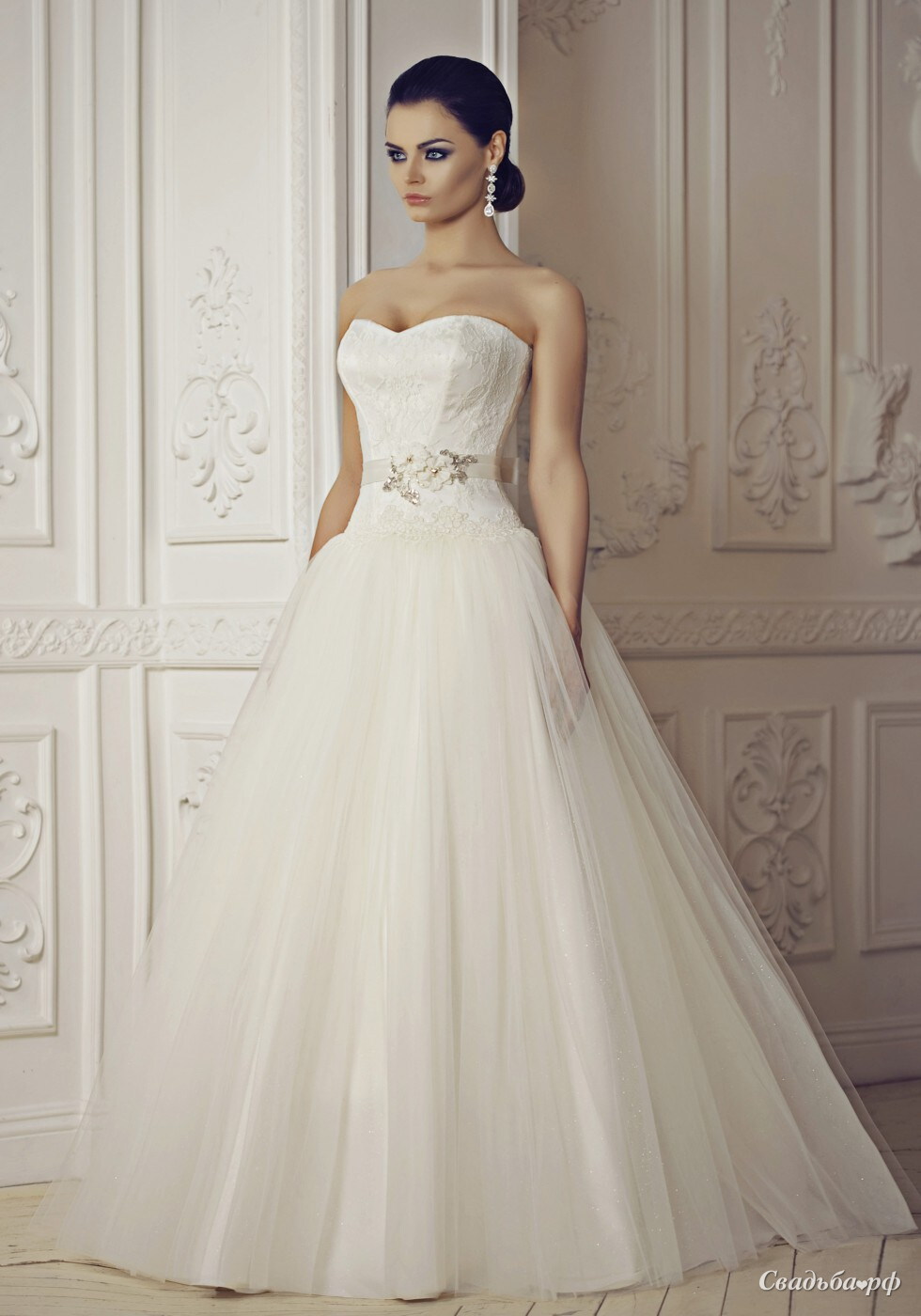 Пышное классическое свадебное платье с мерцающей фатиновой юбкой и элегантным бантом на талии. Нежное кружевное болеро подчеркивает утонченность модели. Строгий удлинённый корсет с фигурным лифом обтянут тонким кружевом с изысканными цветочными узорами. Украшенный сверкающими стразами бант расположен на широком атласном поясе.