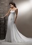 Свадебное платье с удлиненным корсетом из расшитого кружевного полотна. Фигурный лиф эффектно подчёркивает женственность и нежность зоны декольте. Роскошная, украшенная сверкающими стразами, вышитая композиция на бедре даёт начало мягкой драпировке, плавно переходящей в струящуюся юбку. Элегантный шлейф идеально дополняет этот образ.