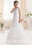 Романтичное свадебное платье с закрытой зоной декольте и кружевными рукавчиками поможет создать невинный образ прекрасной невесты. Талия подчёркнута широким поясом с эффектными лентами. Длинная юбка расширяется к полу. Наряд зрительно вытягивает силуэт и придаёт росту пару дополнительных сантиметров.