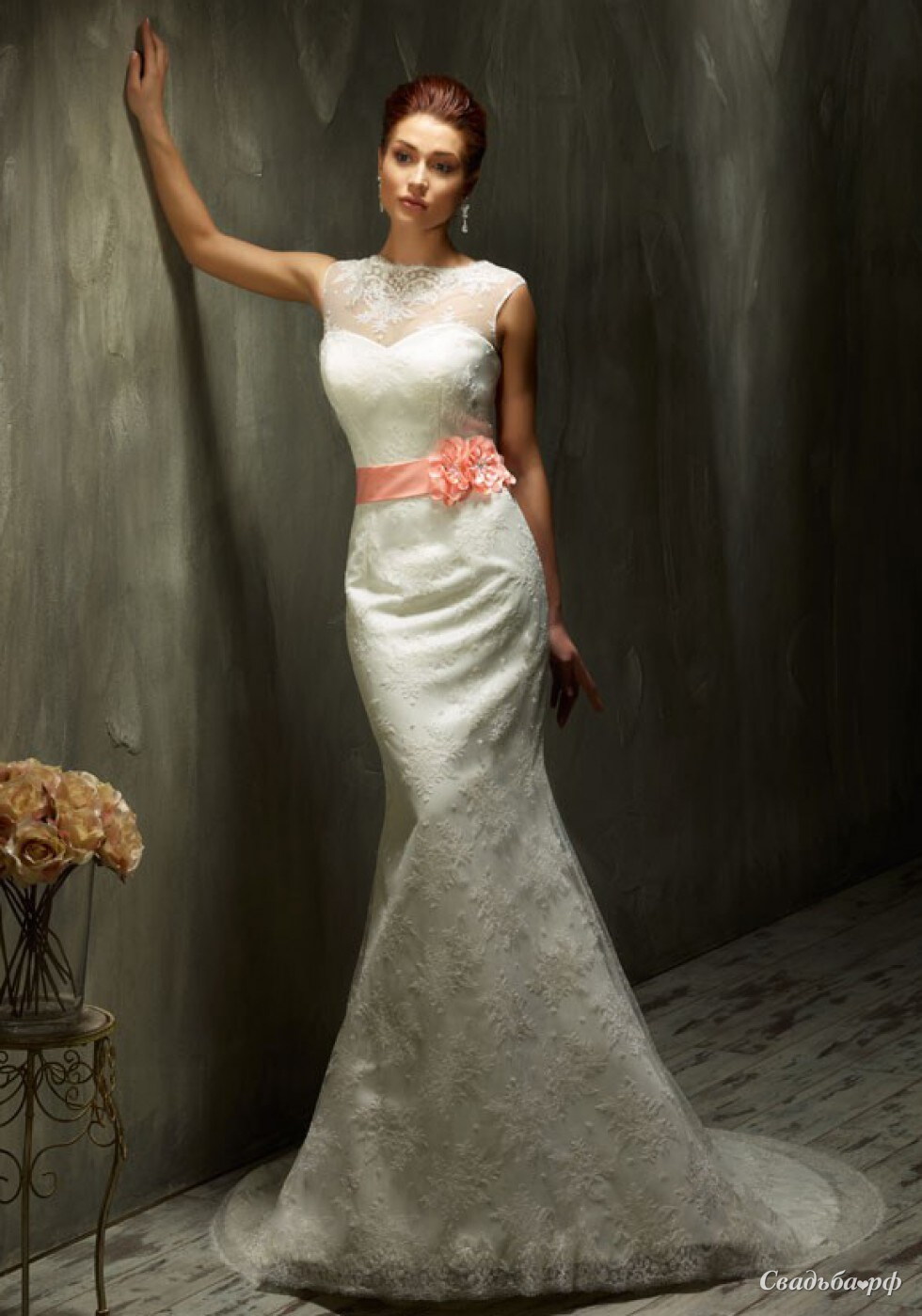 Нежное кружевное платье, линия декольте и спинка закрыты кружевом. Яркий пояс делает эффектный акцент.