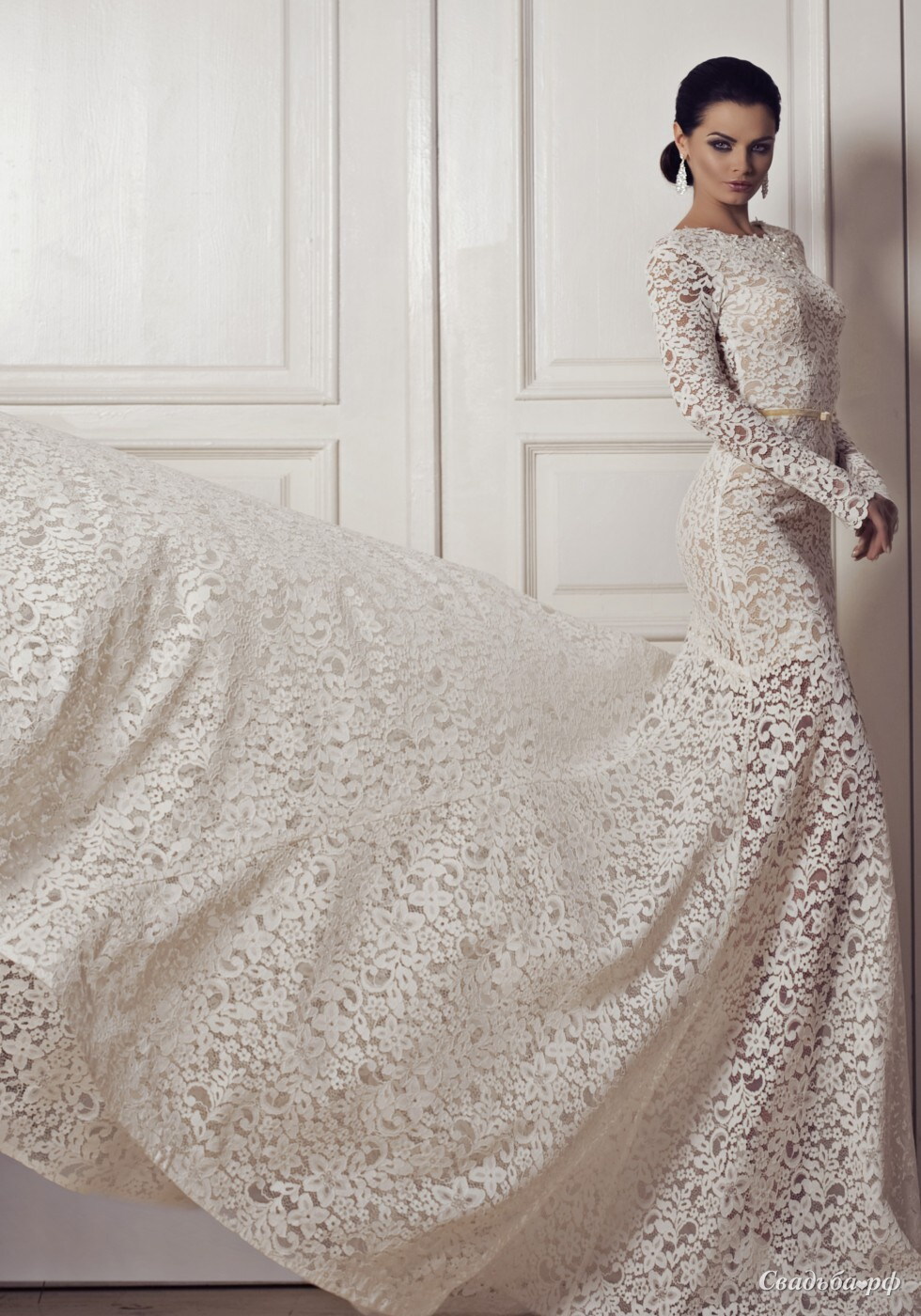 Шикарное свадебное платье из французского кружева эффектно подчеркнет вашу фигуру, королевский шлейф придаст платью необыкновенный шарм.