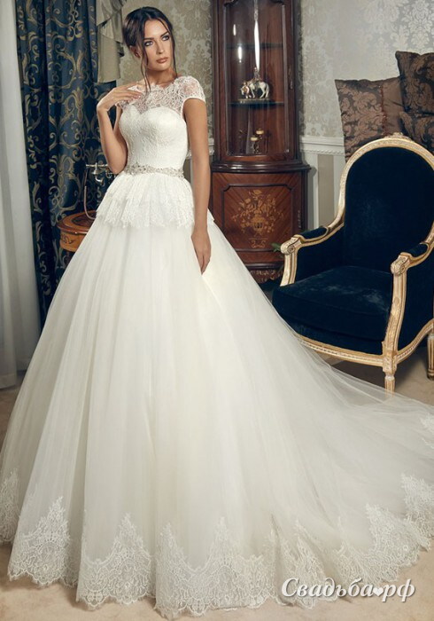 Свадебное платье из фатина как нельзя лучше подойдёт романтичной невесте. Наряд украшен нежным кружевом шантельи. Модель сочетает в себе нежный лиф, V-образную спинку и игривую кружевную юбочку с ажурной окантовкой. Изысканный пояс из драгоценных камней подчеркивает роскошь этого платья. Полупрозрачная вставка на груди приковывает к себе взгляды.