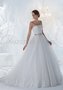 Нежнейшее свадебное платье классического А-силуэта с жестким лифом и прямым корсетом. Линию талии прекрасно подчеркивает россыпь страз, камней и жемчуга. Легкая и воздушная юбка небольшими фатиновыми складками струится вниз и плавно переходит в аккуратный шлейф, украшенный по периметру изысканным кружевом ручной работы.