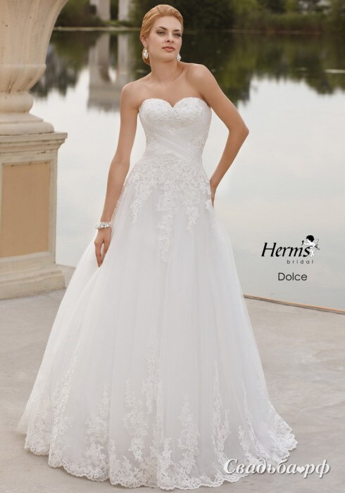 Классическое, но от этого не менее эффектное платье выполнено в традиционном стиле. Жесткий полукруглый лиф, соблазнительно декольте, в районе талии небольшая тканая сборка, что удачно подчеркивает линию груди. Пышная фатиновая юбка, состоящая из сотни фигурных аппликаций в сочетании с кружевным лифом, придают силуэту изысканный стиль.