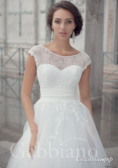 Глубокое декольте, прикрытое великолепным прозрачным кружевом, создает некий флер соблазнительной тайны и недоступности. Кокетливый бант, украшающий притягательный вырез на спине, добавляет образу невесты желанной привлекательности. Завершает чувственный образ легкая воздушная юбка с небольшим шлейфом, пышным облаком ниспадающая к низу.