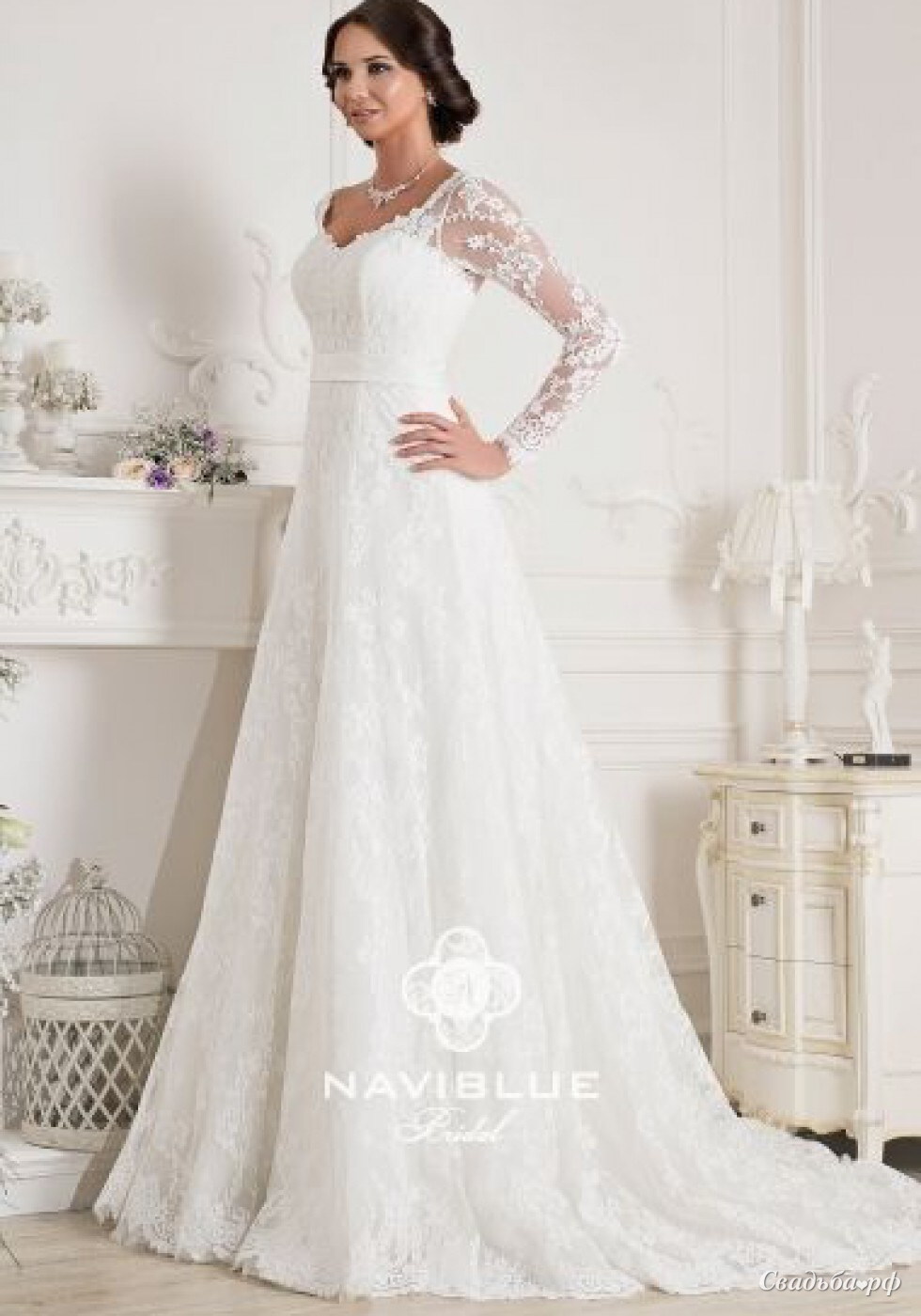 Модель А-силуэта с длинными полупрозрачными рукавами украшена искусно выполненным кружевом. Непышная юбка со шлейфом, ниспадающая к полу легкими складками, придает модели особое великолепие. Атласная лента на поясе, подчеркивающая талию, как нельзя лучше выражает романтичный образ невесты.