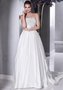 Эффектное свадебное платье выполнено из графского плотного шелковистого атласа, кордового кружева Валансьен и аппликаций из бисера и камней. Миниатюрный корсет с открытой зоной декольте переливается в лучах света. Широкий пояс подчёркивает талию. В меру пышная юбка струится до пола и переходит в шлейф. Элегантный наряд для стильной особы.