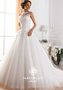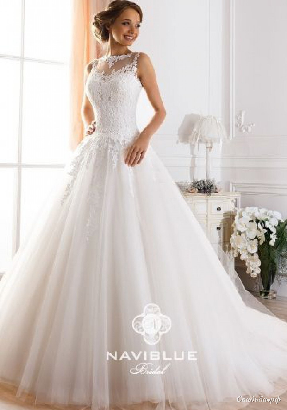 Закрытое свадебное платье в пышном стиле из нежнейшего фатина и великолепных кружев. Вырез у корсета выполнен в форме сердечка. Спинка закрыта полупрозрачным полотном, расшитым по краю нежными кружевными цветами. Пышная струящаяся юбка переходит в небольшой шлейф, который придает модели особенный шарм. Заниженный корсет подчеркивает стройность фигуры.