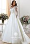 Атласное свадебное платье с пышной юбкой со складками, которое превратит невесту в настоящую принцессу. Его изюминка — закрытый кружевной корсет с длинными рукавами. Спинка модели украшена маленькими пуговками. На талии тонкий атласный поясок, подчеркивающий талию.