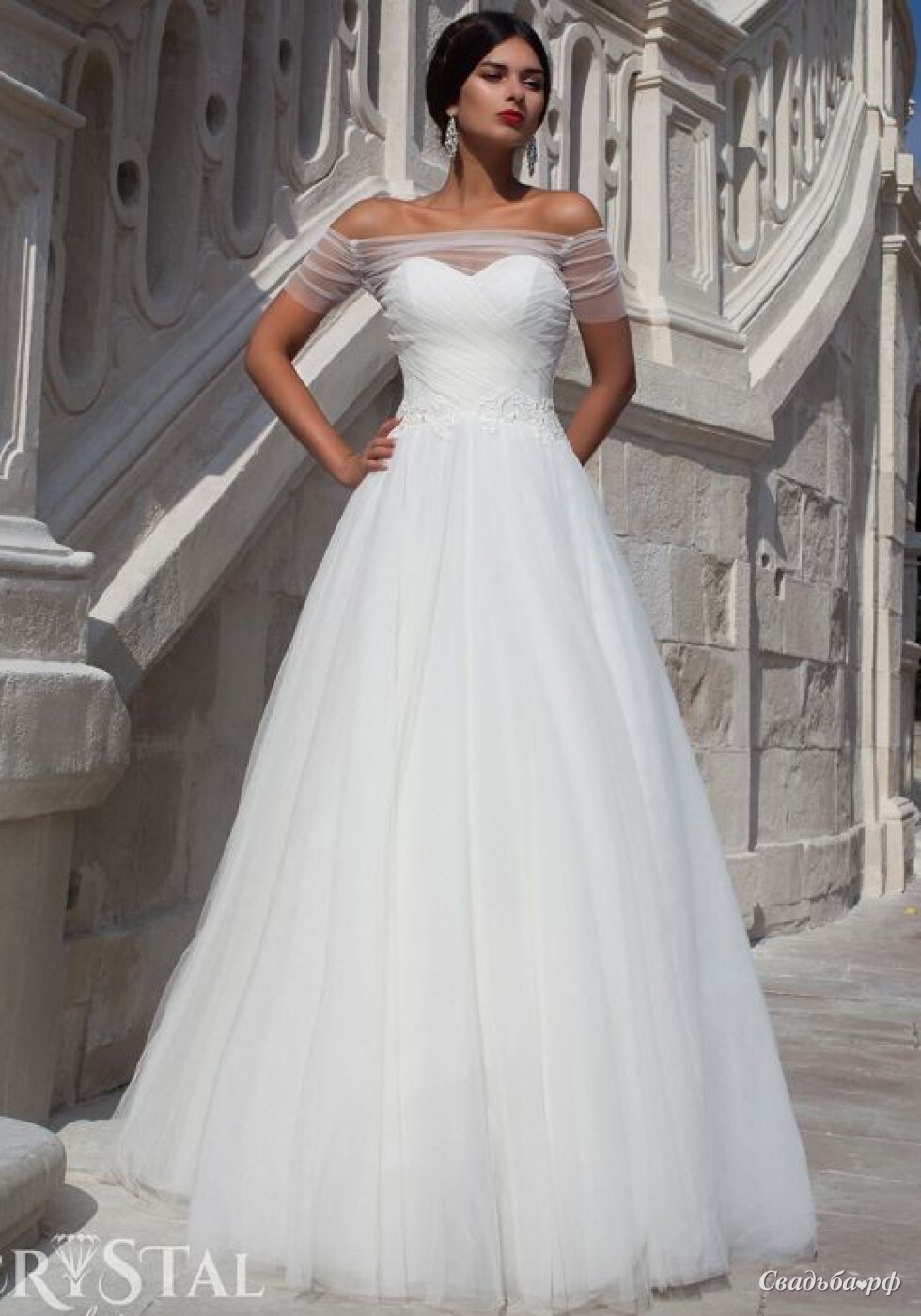 Свадебное платье с открытыми плечами великолепно подойдет невестам, желающим подчеркнуть свою хрупкость. Это возможно благодаря необычным воздушным рукавчикам из легкой прозрачной ткани, которая завязывается сзади. Корсет модели украшен мелкими складочками, позволяющими скрыть недостатки и одновременно подчеркнуть линии фигуры. Талия акцентирована оригинальной кружевной аппликацией, переходящей на спину и украшающей линию шнуровки на корсете. Простая юбка из фатина подчеркивает изящный образ.