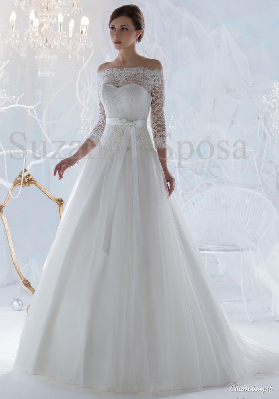 Свадебное платье из фатина и кружева с утонченным романтичным дизайном. Корсет украшен изящным французским кружевом, он имеет закрытую зону декольте, рукава 3/4 и открытые плечи. Талия украшена очаровательным атласным поясом. Пышная юбка придает наряду воздушность и торжественность.