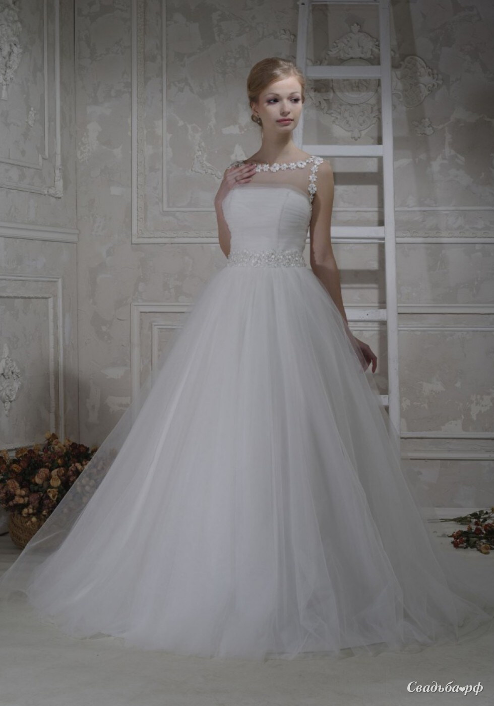 Воздушное свадебное платье с пышной юбкой, сотканной из изысканного атласа и воздушного фатина. Плечи нежно прикрыты кружевом. Завершает неповторимый образ восхитительный пояс под грудью. Это свадебное платье с закрытым верхом – идеальный вариант как для торжественной церемонии в ЗАГСе, так и для венчания в церкви.
