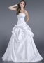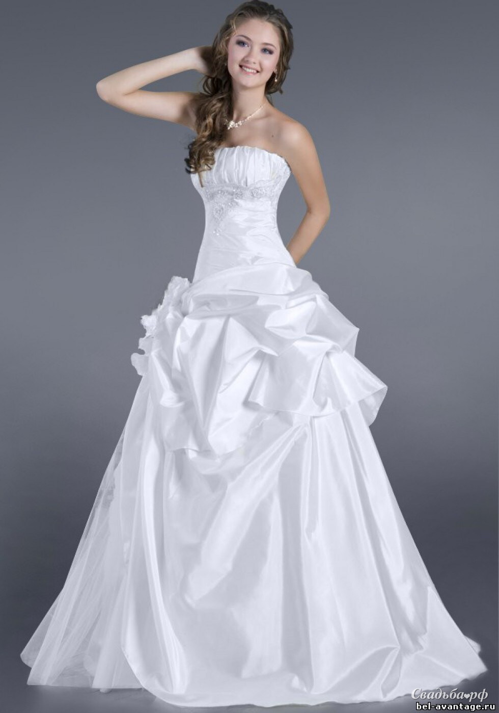 Эффектное свадебное платье придает образу невесты изысканность и романтичность. Платье с удлиненным корсетом, украшенным бисером. Пышная юбка с изящным шлейфом выполнена из благородного атласа. Наряд зрительно увеличивает бюст и выгодно подчёркивает осиную талию своей обладательницы. На юбке объёмные сборки.