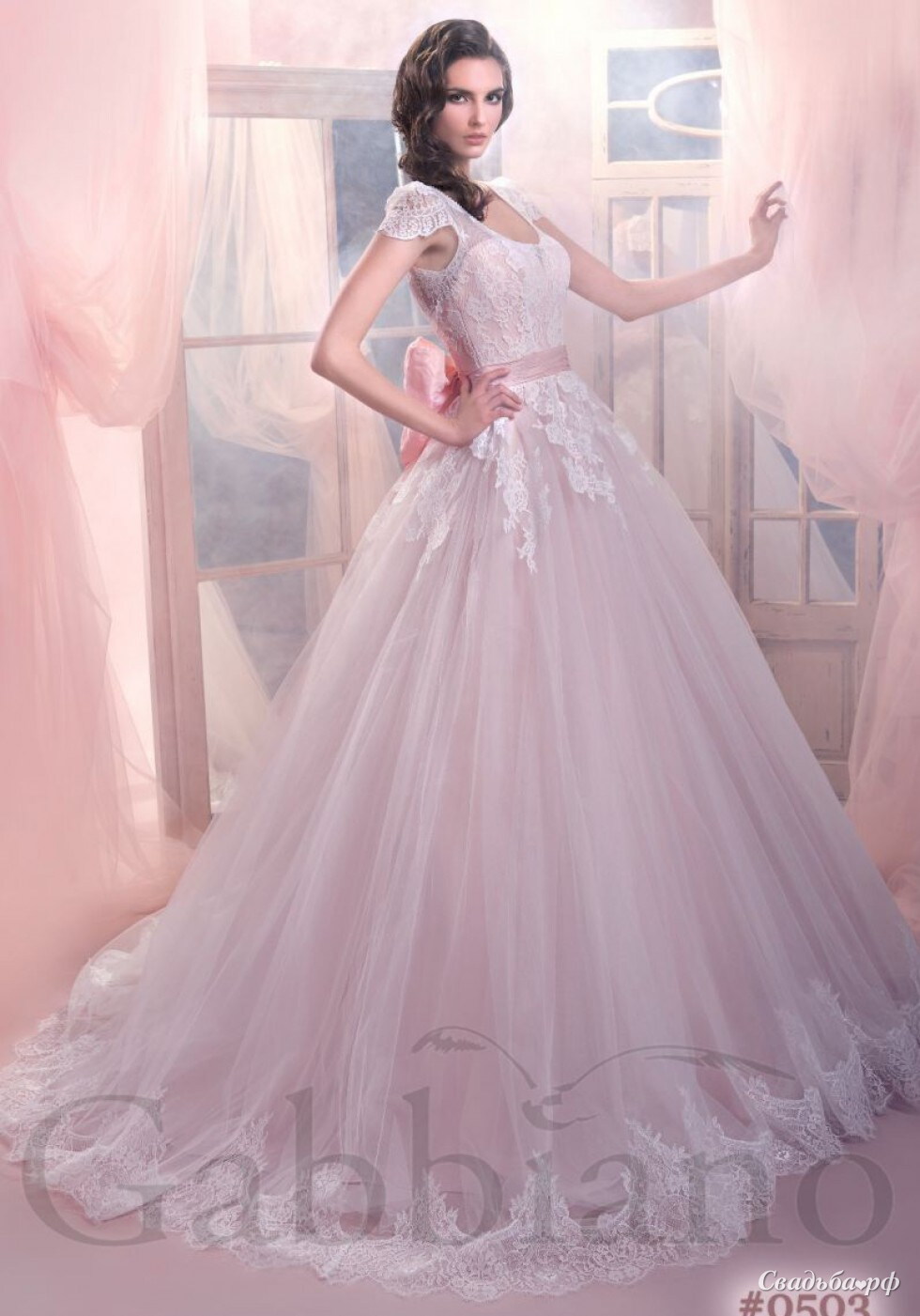 Мечтаете о романтичном свадебном образе? Тогда этот наряд нежного розового цвета придётся Вам по душе. Кружевной корсет с плечиками – рукавчиками, вырезом на груди и спинке идеально садится по фигуре. Талия подчёркнута широким поясом с бантом, расположившимся на пояснице. Пышная юбка с кружевной окантовкой переходит в шлейф.