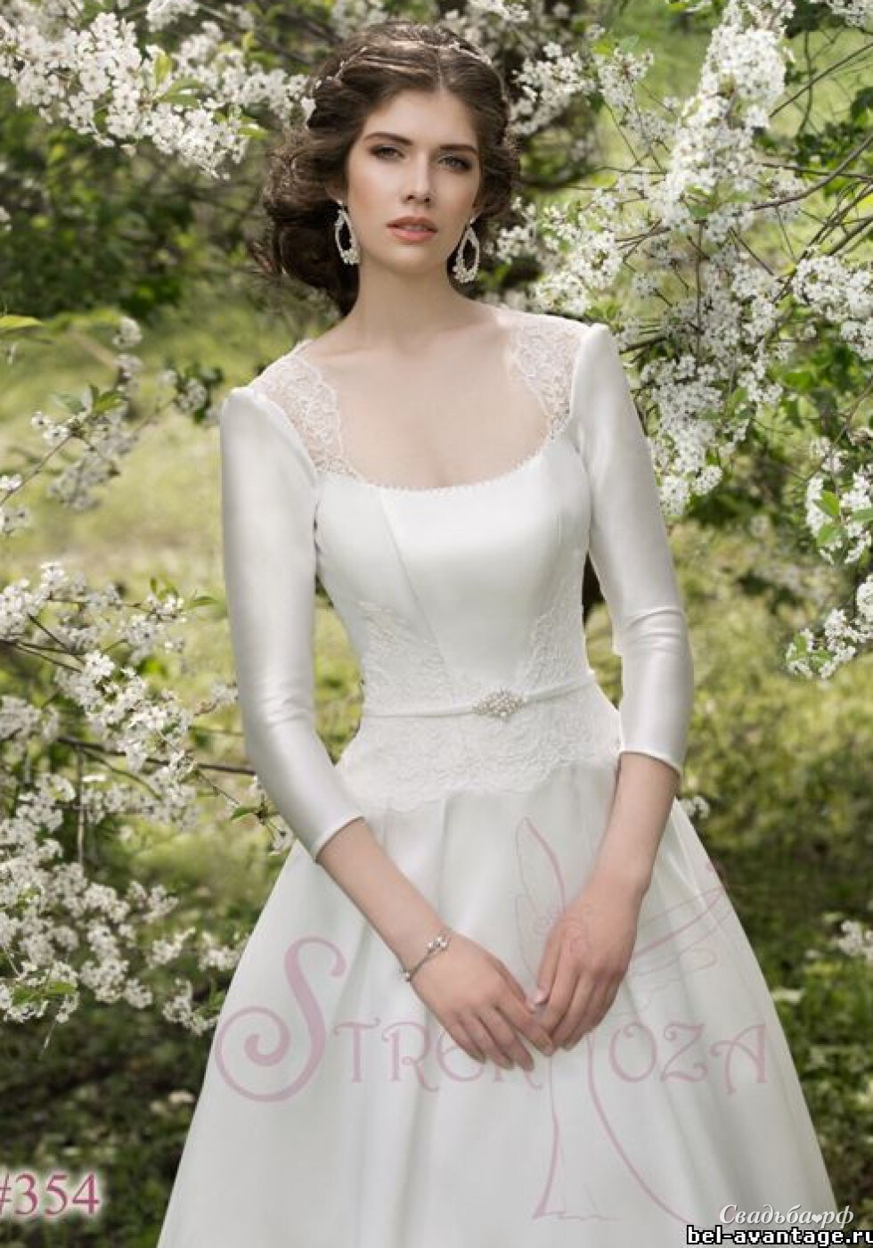 Благородное свадебное платье с рукавами 3/4 выполнено из мерцающего атласа и тонкого кружево. Такое сочетание придаёт образу утончённость. Округлый вырез на груди и небольшая выемка на спинке акцентируют внимание окружающих на невесте. Талия украшена тонким поясом. Длинная юбка переходит в небольшой шлейф.