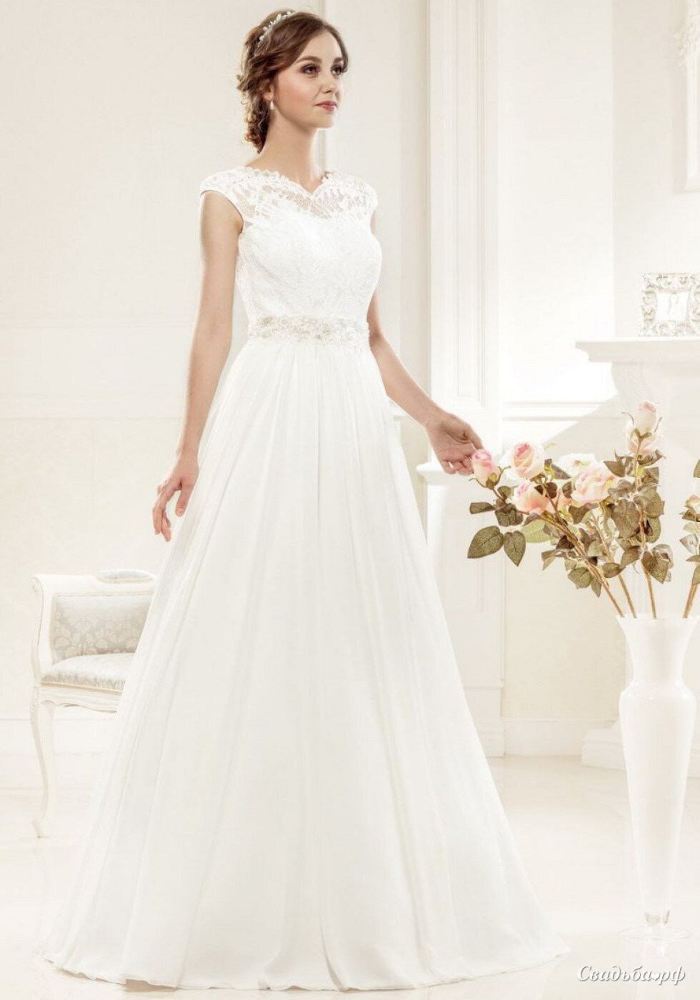 Красивое свадебное платье прямого кроя с закрытым верхом. Корсет украшен нежным кружевом. Талия акцентирована расшитым поясом из стекляруса и страз Сваровски. Прямая длинная юбка с небольшими складками невероятно стройнит и делает фигуру хрупкой и воздушной.
