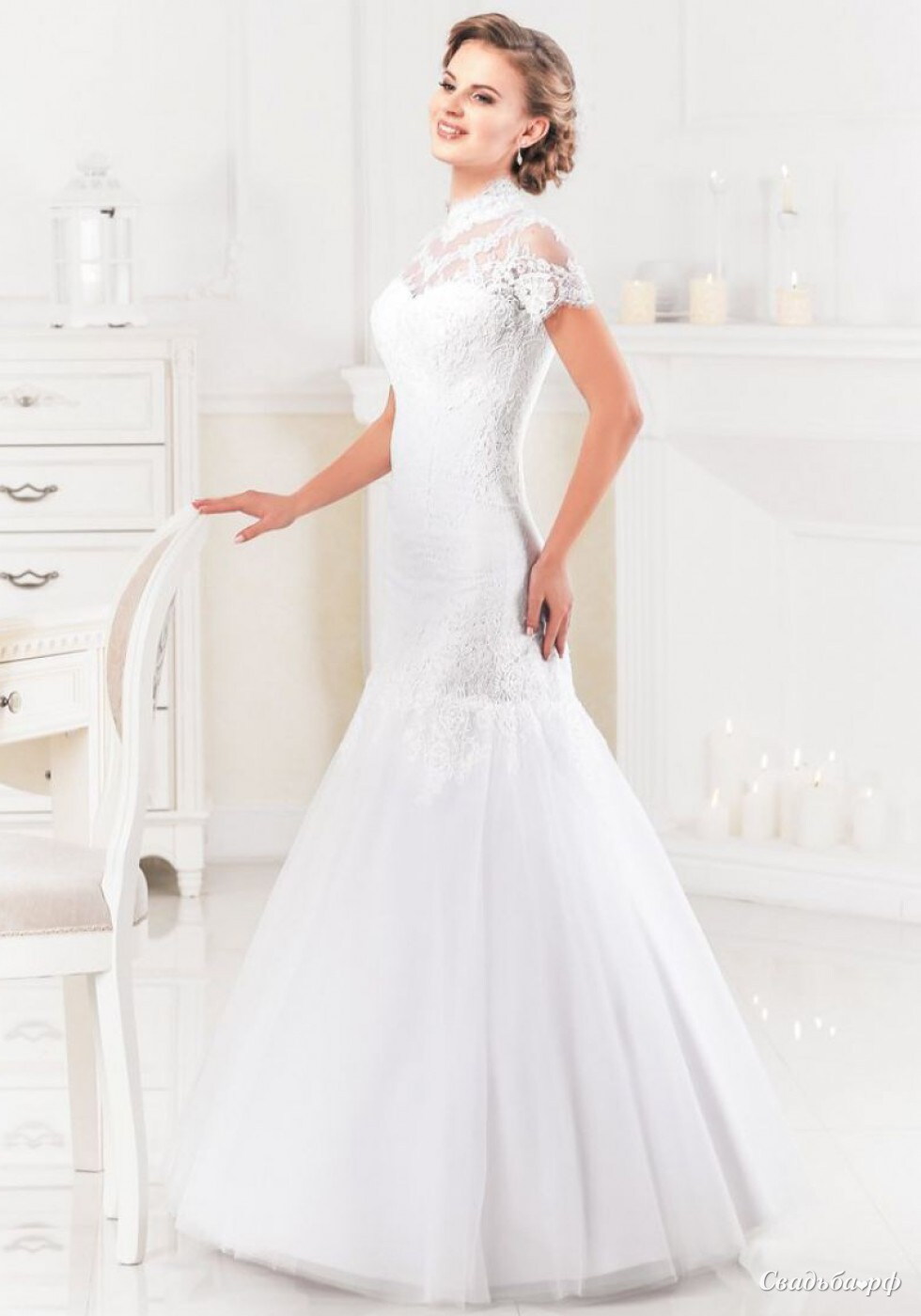 Кружевное свадебное платье в стиле рыбка будет выигрышно смотреться на стройной фигуре и подчеркнет все достоинства. Французское кружево украшает облегающий корсет, зону декольте, воротничок-стойку, маленькие рукавчики и наполовину открытую спинку, придавая образу невероятную женственность. Шнуровка на корсете позволяет наряду великолепно сидеть на фигуре.