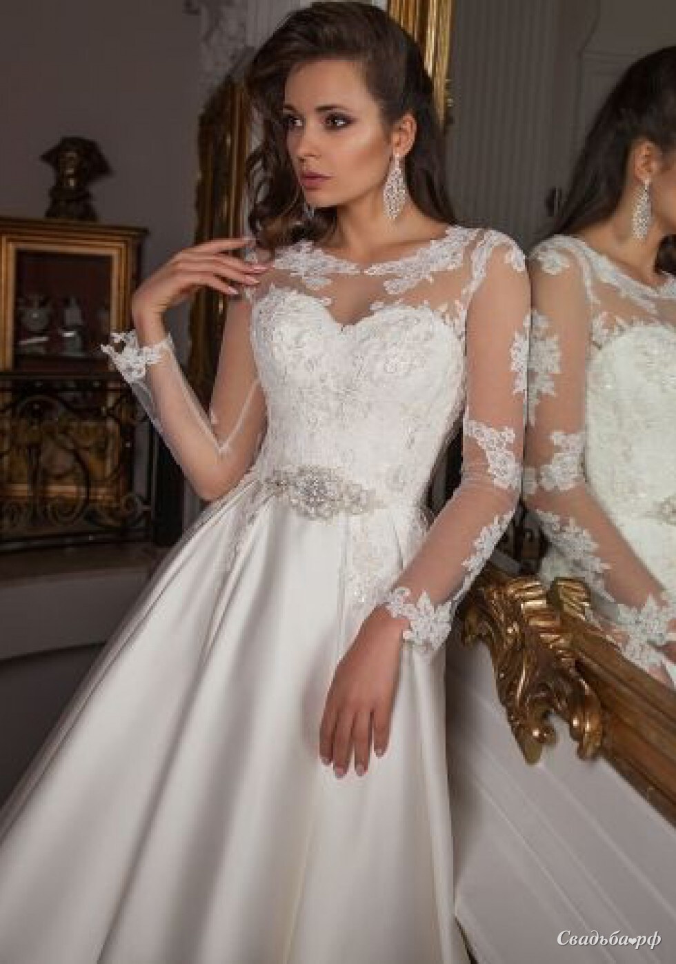 Свадебное платье с кружевным корсетом дополнено длинными рукавами и закрытой спинкой. Облегающий корсет превосходно подчеркивает прекрасную фигуру. Очень нежное кружево украшает верхнюю часть модели. Роскошная расшивка акцентирует внимание на талии. Элегантная атласная юбка со шлейфом завершает образ, придавая ему утонченность.
